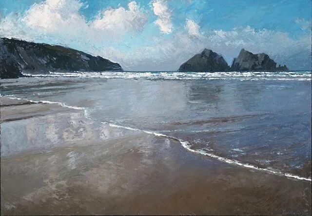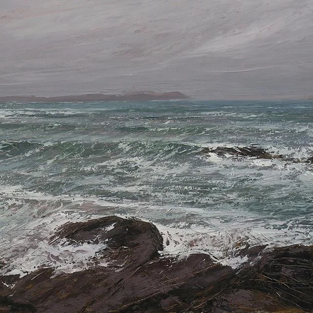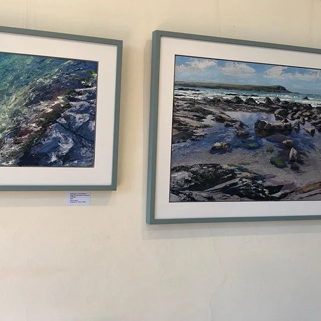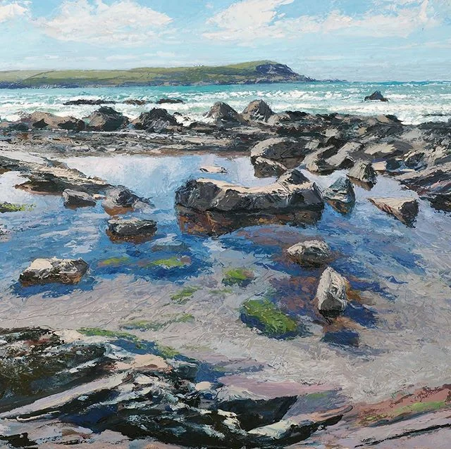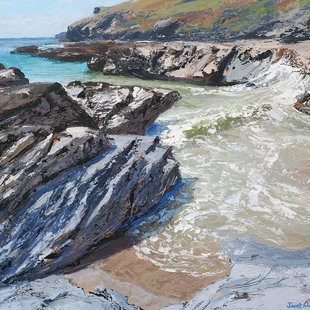 In her most recent collection of paintings of the rocky shorelines, Janet has focussed specifically upon a small stretch of the rugged coastline - between Port Quin and Polzeath. She returns regularly to this scenic area to walk, kayak, photograph, sketch and observe as the tide rolls out to reveal deep, glassy rock pools and perfectly clear views to the seabed below.